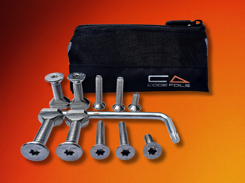 Customiser votre foil avec notre kit de visserie premium en acier inoxydable de qualité marine supérieure spécialement développé pour une durabilité maximale, un ajustement de précision pour les systèmes Code Foils et une facilité d’utilisation. Contrairement aux kits standards, ces vis disposent toutes d’une tête T30 (et non T40 pour les 4 vis de platine), pour que n’ayez désormais besoin que d’une seule clé T30 pour monter l’ensemble de votre set-up. Le kit comprend: 4 × M8 × 32 mm + T-nuts (platine), 4 × M6 × 30 mm (aile avant-mat et fuselage), 2 × M6 × 16 mm (stab) , une clé torx T30 en inox et une pochette de rangement.